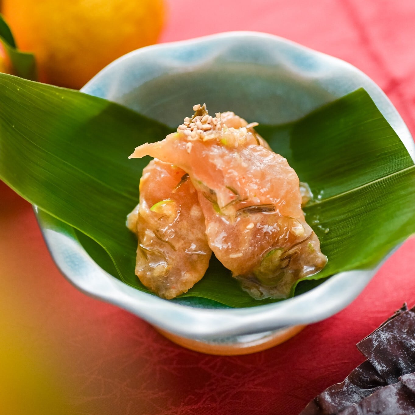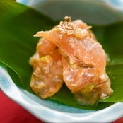 富山湾で水揚げされた鮮魚を一度昆布締めしてから、たっぷりの香味野菜と昆布で仕込んだ贅沢な「うまみダレ」をまとわせました。