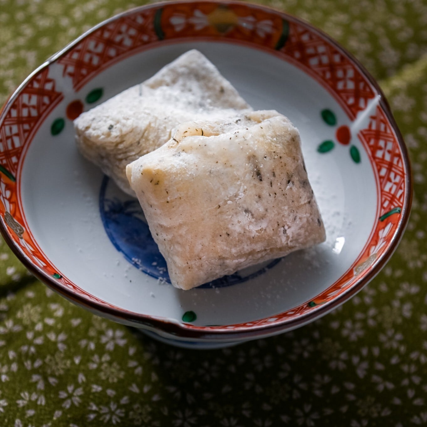 ◎王道の「こんぶもち」には、地元・生地の老舗「四十物昆布」の厳選した真昆布を使用し、奥深い旨味と塩気を引き立てています。