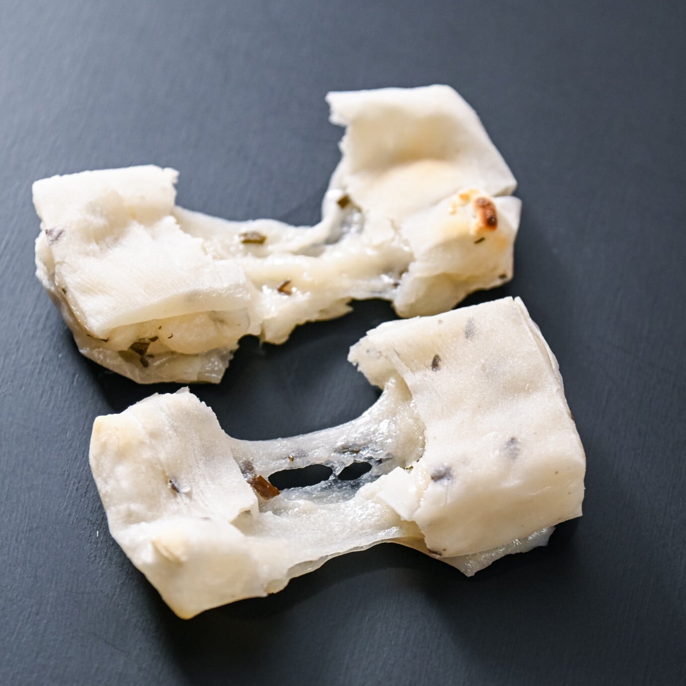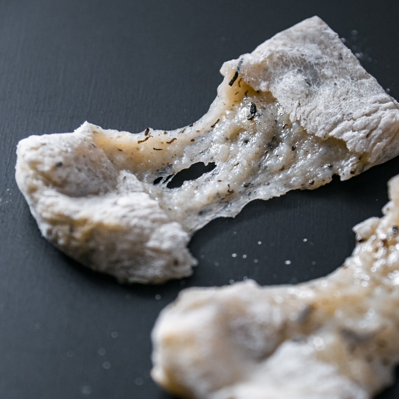 ◎新作の「ながらももち」は、若旦那が試行錯誤の末に生み出した、当館が元祖となるオリジナル商品です。生地の海で水揚げされた鮮度抜群で上質な「ながらも(アカモク)」を採用。丁寧に天日干ししたものをたっぷりと練り込み、噛むほどに溢れる海の旨みと、クセになる新食感を実現しました。